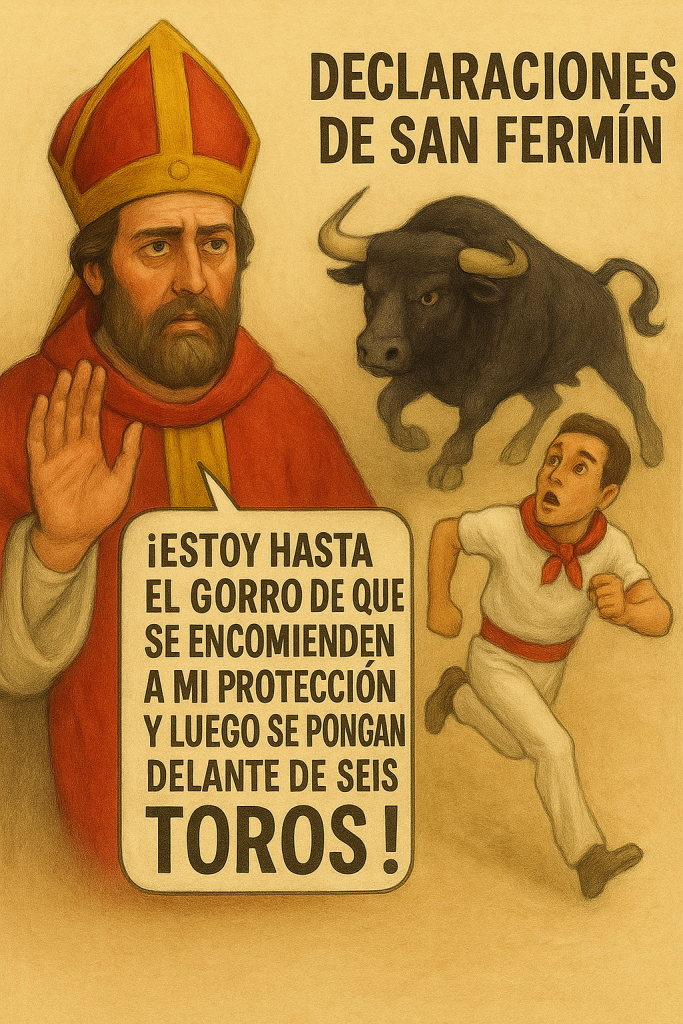 Memoria del Futuro ha ido un paso más allá de las crónicas habituales, hemos buscado declaraciones del protagonista, el propio San Fermín. Nos ha dicho: “estoy hasta el gorro (eufemismo) de que se encomienden a mi protección y acto seguido se pongan delante de seis toros bravos. ¡Pero a qué alma de cántaro se le ocurre semejante despropósito! Durante ocho días tengo que trabajar a destajo”. Sant Fermín continúa desbocado: “¿sabéis cuánto cuesta desviar una asta de toro que pasa pegado a un corredor? Si fuera uno o dos, vale. El problema es que hay centenares actuando al unísono y es casi imposible salvarlos a todos. Porque nunca un medio de comunicación me ha preguntado mi opinión, pero yo aprovecho ahora para decir que me parece una burrada absoluta”.